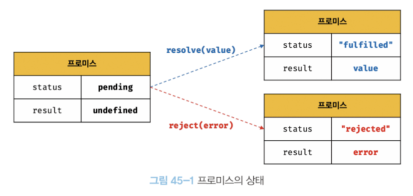 - Rejected(거부) : 비동기 처리가 실패하거나 오류가 발생한 상태