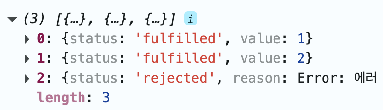 Promise.allSettled 메소드가 반환한 배열에는 fulfilled 또는 rejected 상태와 상관없이 모든 프로미스들의 처리 결과가 담겨있다.
